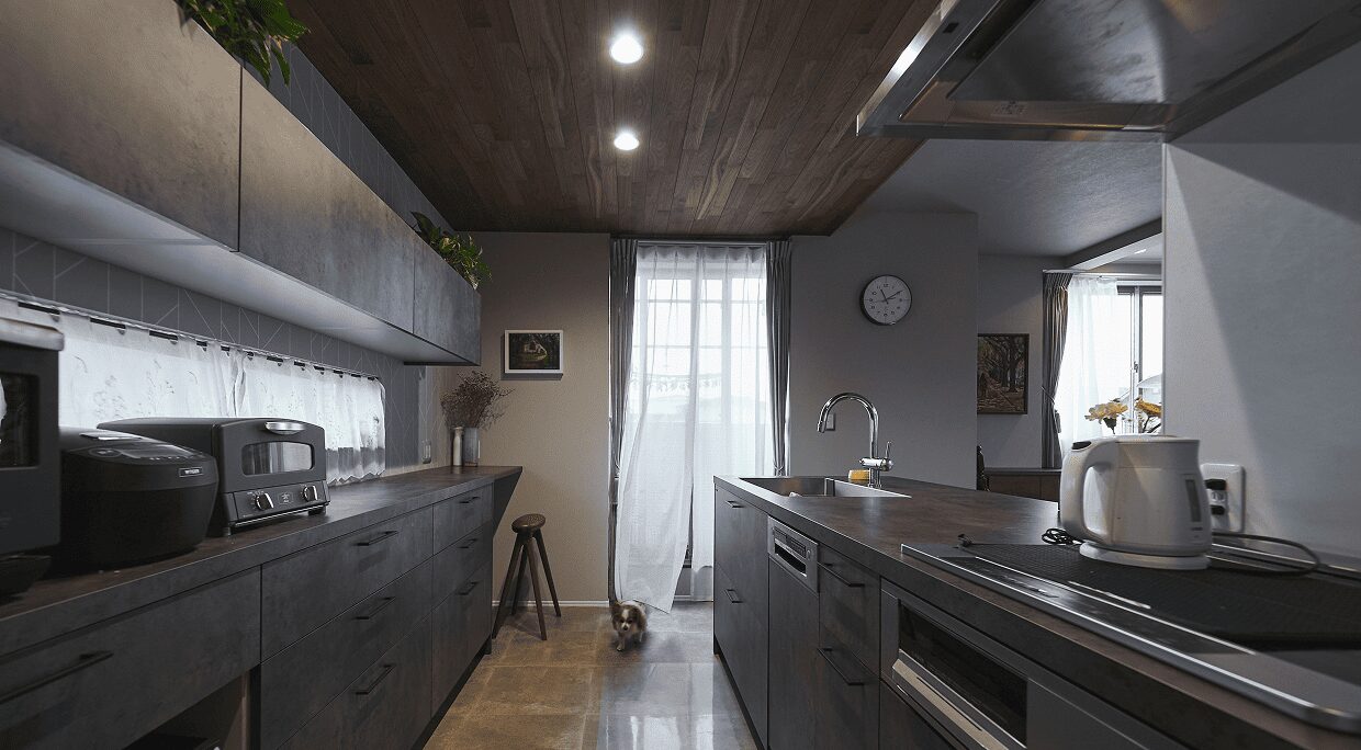 2階のLDKは、親族が集まってもゆったり過ごせるように広々としたスペースを確保しました。ダイニングは、お気に入りのテーブルに合わせたグレートーン×ウォルナットの床でシックにコーディネート。キッチンは、天井を折り下げてカフェのような雰囲気を演出し、背面収納も充実させてモノを隠すことで、常にスタイリッシュな空間を保っています。